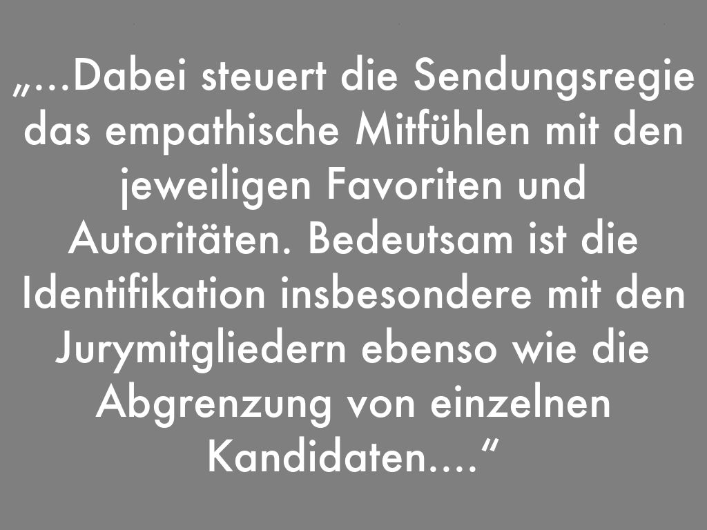 „...Dabei steuert die Sendungsregie das empathische Mitfühlen mit den jeweiligen Favoriten und Autoritäten. Bedeutsam ist die Identifikation insbesondere mit den Jurymitgliedern ebenso wie die Abgrenzung von einzelnen Kandidaten....“