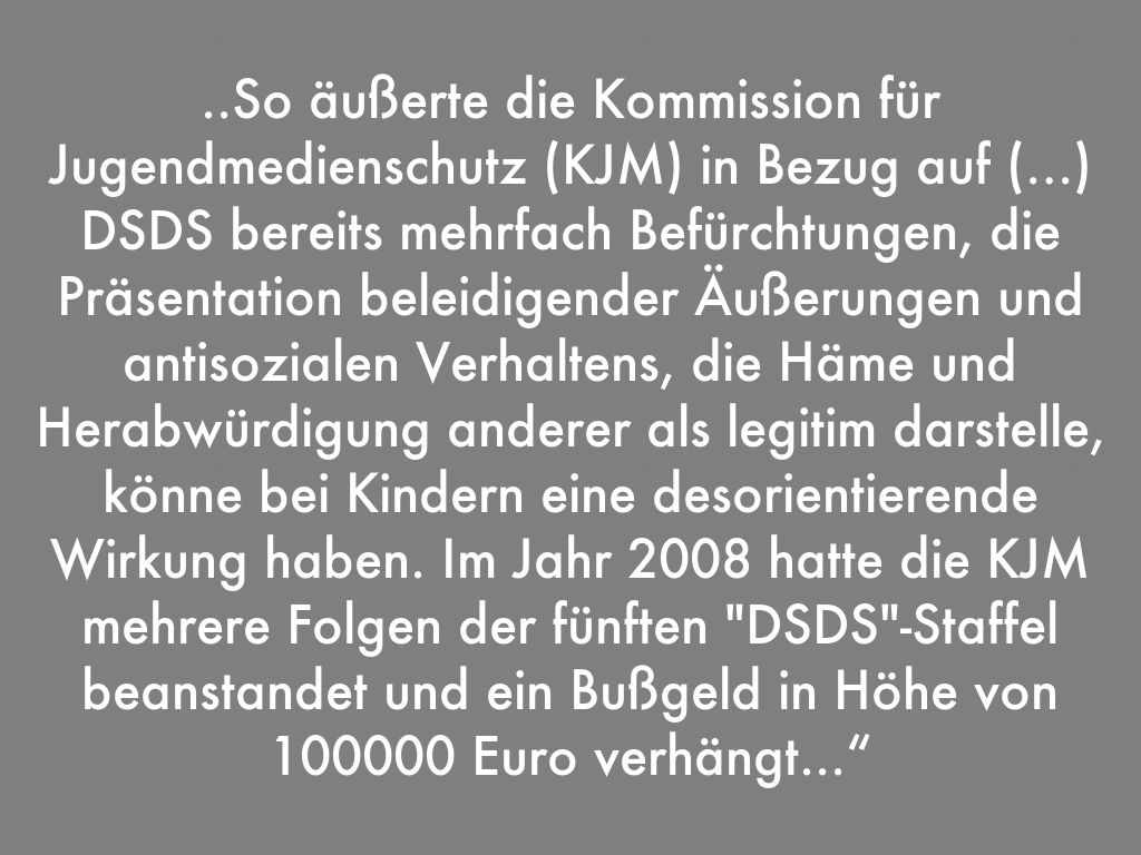 ..So äußerte die Kommission für Jugendmedienschutz (KJM) in Bezug auf (…) DSDS bereits mehrfach Befürchtungen, die Präsentation beleidigender Äußerungen und antisozialen Verhaltens, die Häme und Herabwürdigung anderer als legitim darstelle, könne bei Kindern eine desorientierende Wirkung haben. Im Jahr 2008 hatte die KJM mehrere Folgen der fünften "DSDS"-Staffel beanstandet und ein Bußgeld in Höhe von 100000 Euro verhängt...“