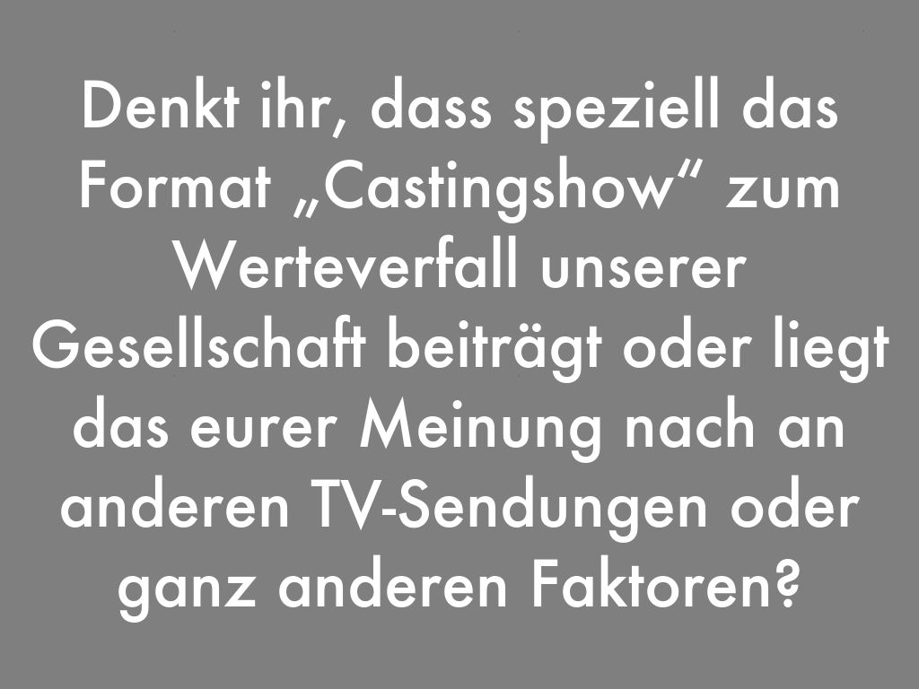 Denkt ihr, dass speziell das Format „Castingshow“ zum Werteverfall unserer Gesellschaft beiträgt oder liegt das eurer Meinung nach an anderen TV-Sendungen oder ganz anderen Faktoren?