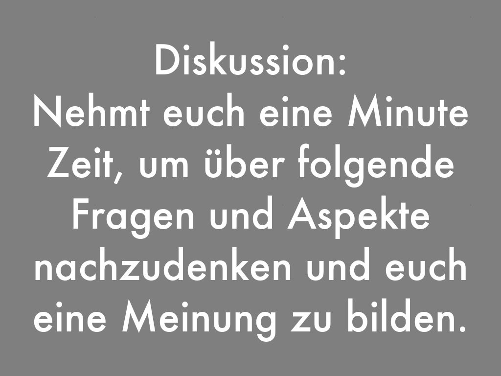 Nehmt euch eine Minute Zeit, um über folgende Fragen und Aspekte nachzudenken und euch eine Meinung zu bilden.