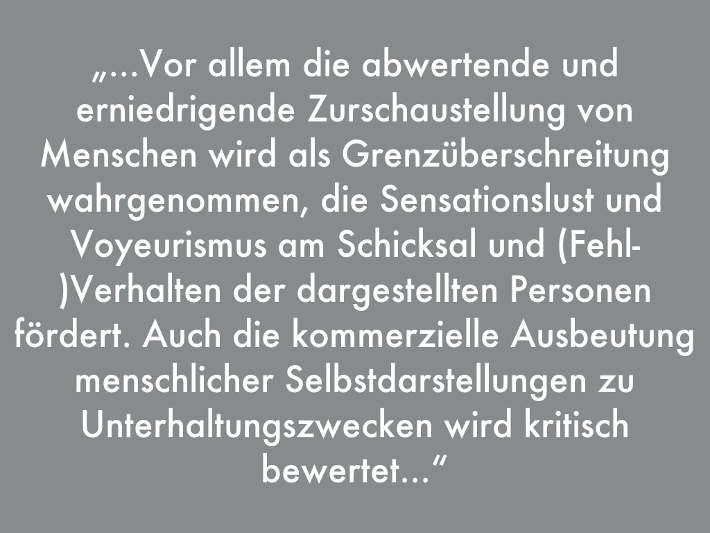 „...Vor allem die abwertende und erniedrigende Zurschaustellung von Menschen wird als Grenzüberschreitung wahrgenommen, die Sensationslust und Voyeurismus am Schicksal und (Fehl-)Verhalten der dargestellten Personen fördert. Auch die kommerzielle Ausbeutung menschlicher Selbstdarstellungen zu Unterhaltungszwecken wird kritisch bewertet...“