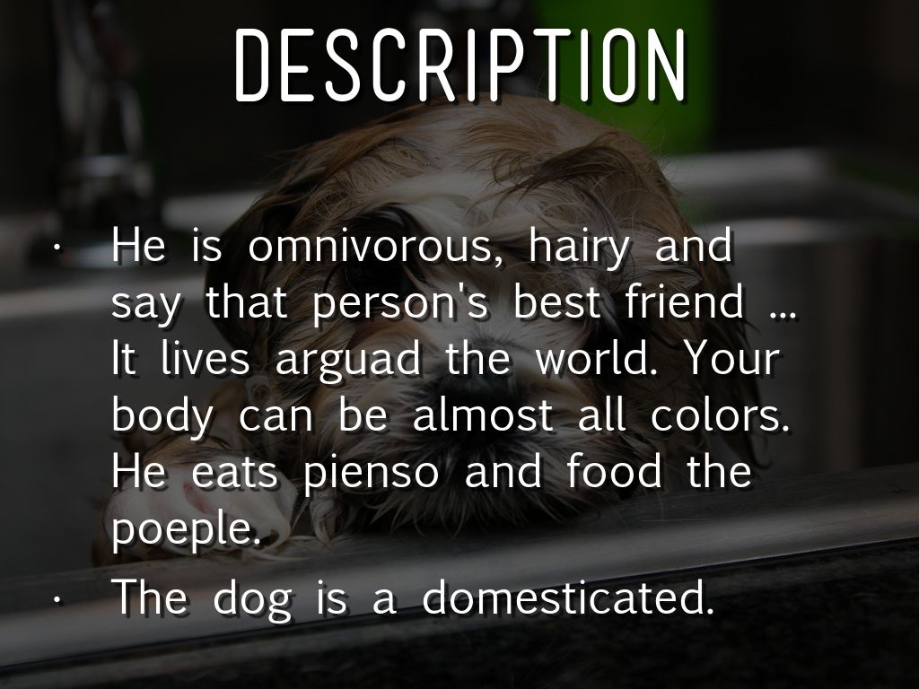 He is omnivorous, hairy and say that person's best friend ... It lives arguad the world. Your body can be almost all colors. He eats pienso and food the poeple.
