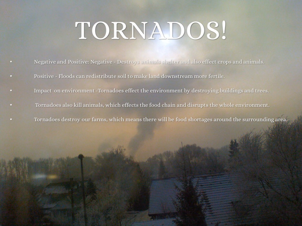 • Tornadoes also kill animals, which effects the food chain and disrupts the whole environment.