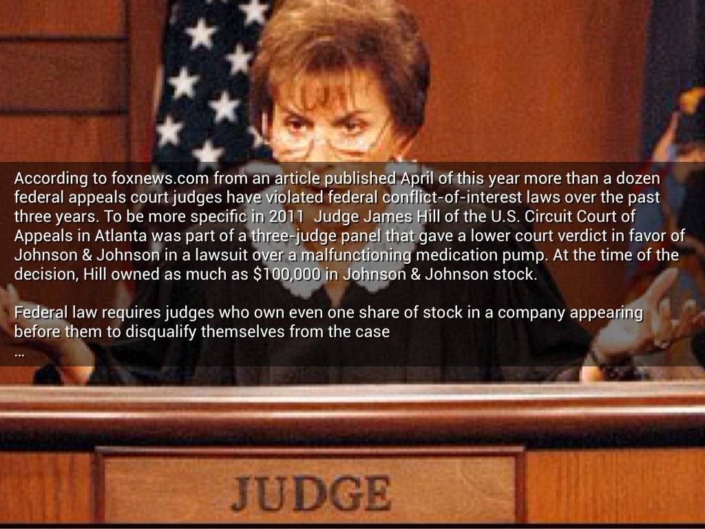 According to foxnews.com from an article published April of this year more than a dozen federal appeals court judges have violated federal conflict-of-interest laws over the past three years. To be more specific in 2011 Judge James Hill of the U.S. Circuit Court of Appeals in Atlanta was part of a three-judge panel that gave a lower court verdict in favor of Johnson & Johnson in a lawsuit over a malfunctioning medication pump. At the time of the decision, Hill owned as much as $100,000 in Johnson & Johnson stock.