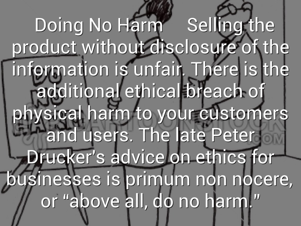 Doing No Harm Selling the product without disclosure of the information is unfair. There is the additional ethical breach of physical harm to your customers and users. The late Peter Drucker's advice on ethics for businesses is primum non nocere, or “above all, do no harm.”