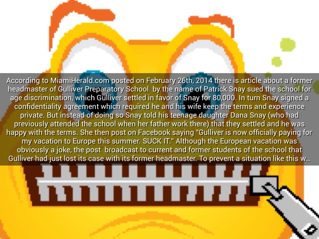 According to MiamiHerald.com posted on February 26th, 2014 there is article about a former headmaster of Gulliver Preparatory School by the name of Patrick Snay sued the school for age discrimination, which Gulliver settled in favor of Snay for 80,000. In turn Snay signed a confidentiality agreement which required he and his wife keep the terms and experience private. But instead of doing so Snay told his teenage daughter Dana Snay (who had previously attended the school when her father work there) that they settled and he was happy with the terms. She then post on Facebook saying "Gulliver is now officially paying for my vacation to Europe this summer. SUCK IT.” Although the European vacation was obviously a joke, the post broadcast to current and former students of the school that Gulliver had just lost its case with its former headmaster. To prevent a situation like this was direct reason for the confidentiality agreement and in doing this the Snays breached. So once word of this post got back to Gulliver's attorneys Gulliver refused to pay appealed the decision of the settlement and the case was ruled in favor of Gulliver for breach of confidentiality.