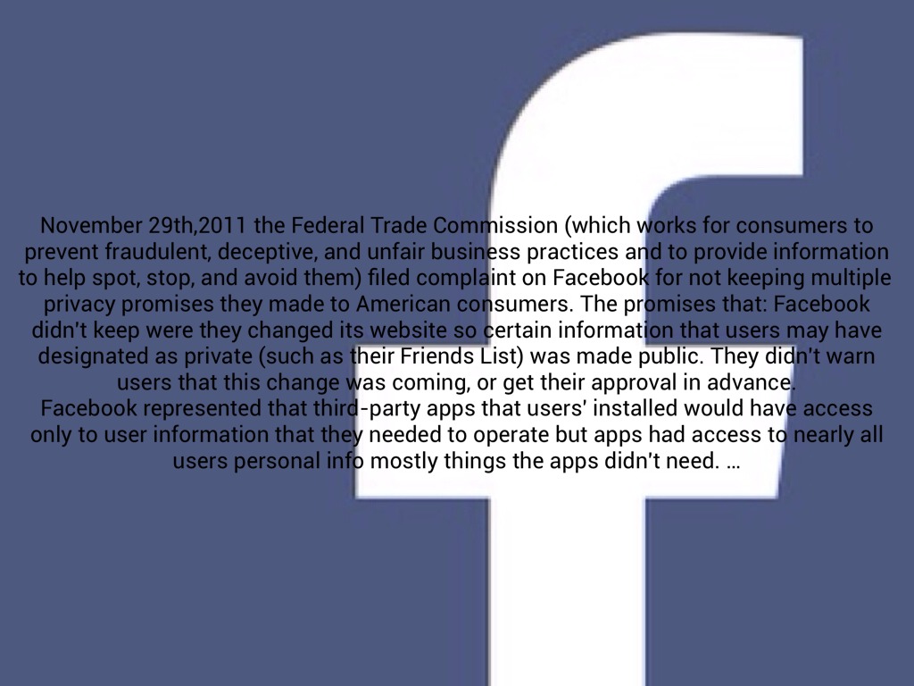 November 29th,2011 the Federal Trade Commission (which works for consumers to prevent fraudulent, deceptive, and unfair business practices and to provide information to help spot, stop, and avoid them) filed complaint on Facebook for not keeping multiple privacy promises they made to American consumers. The promises that: Facebook didn't keep were they changed its website so certain information that users may have designated as private (such as their Friends List) was made public. They didn't warn users that this change was coming, or get their approval in advance.