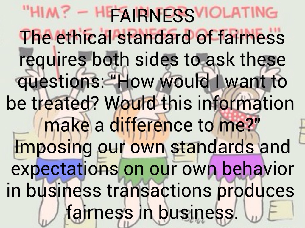The ethical standard of fairness requires both sides to ask these questions: “How would I want to be treated? Would this information make a difference to me?” Imposing our own standards and expectations on our own behavior in business transactions produces fairness in business.