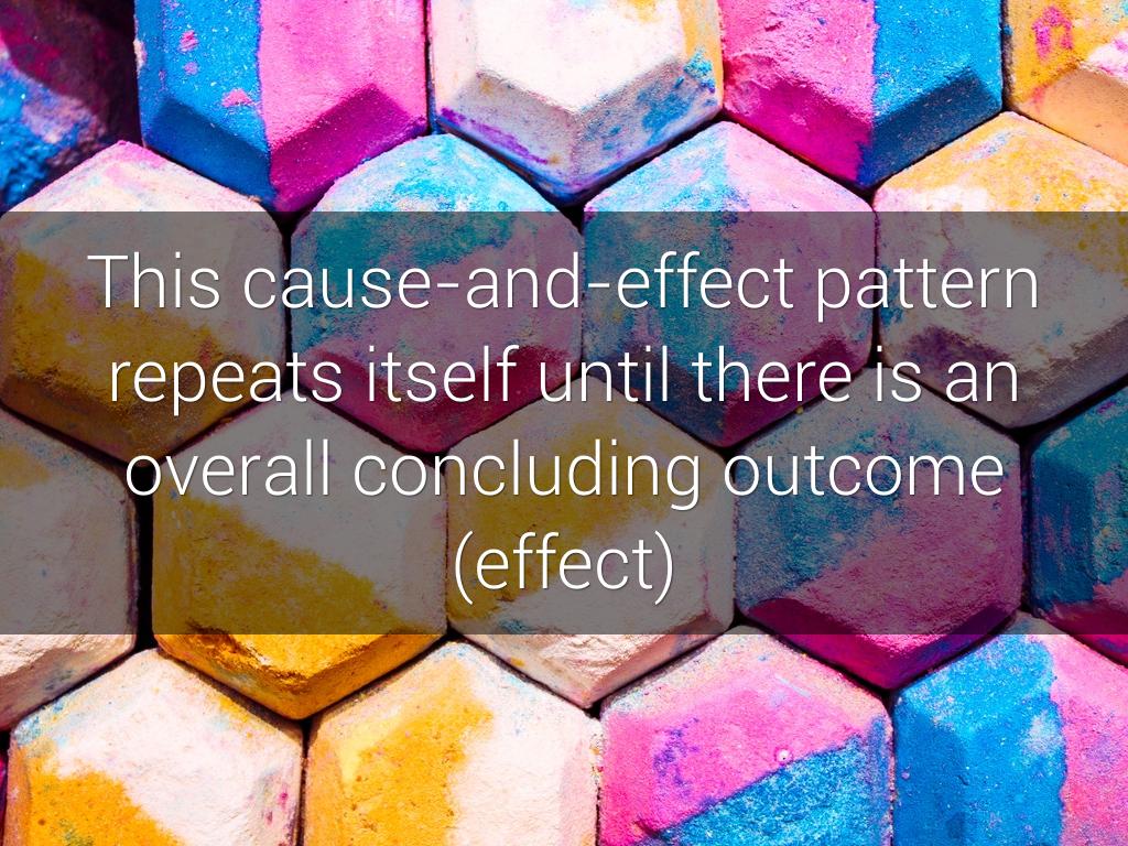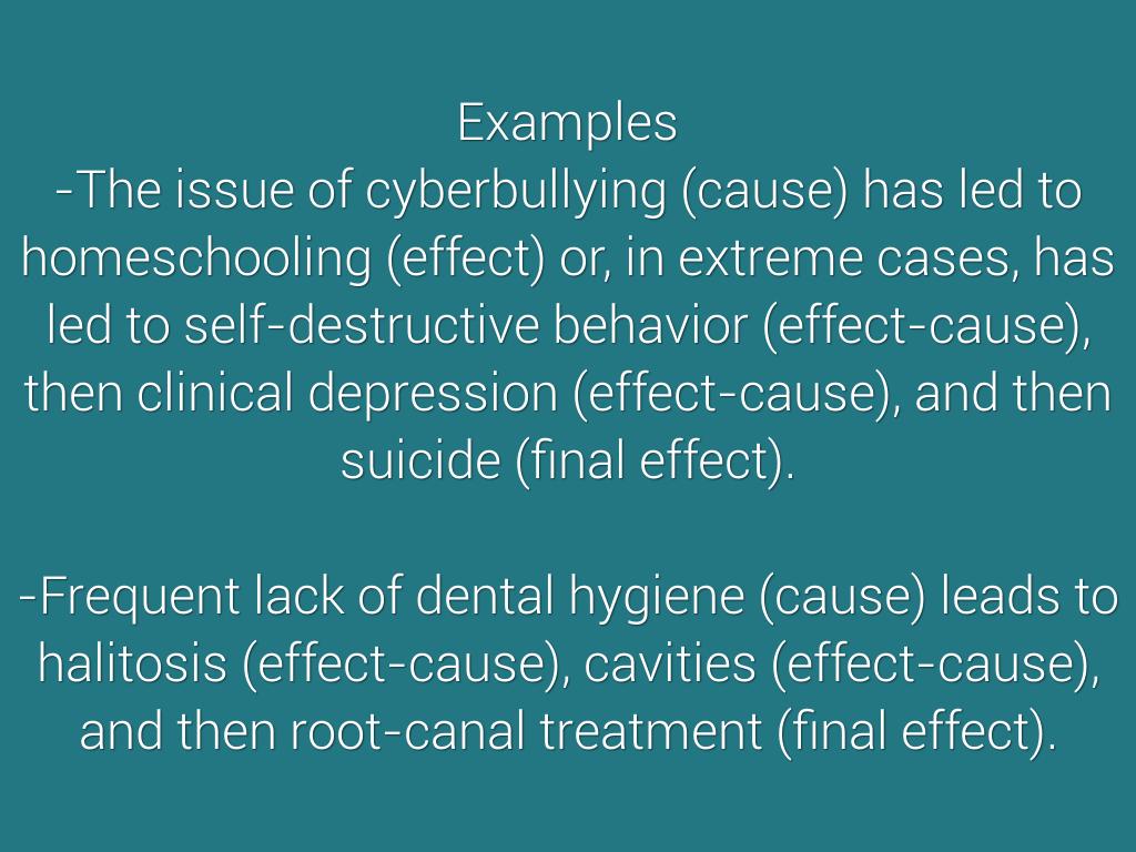 -The issue of cyberbullying (cause) has led to homeschooling (effect) or, in extreme cases, has led to self-destructive behavior (effect-cause), then clinical depression (effect-cause), and then suicide (final effect).
