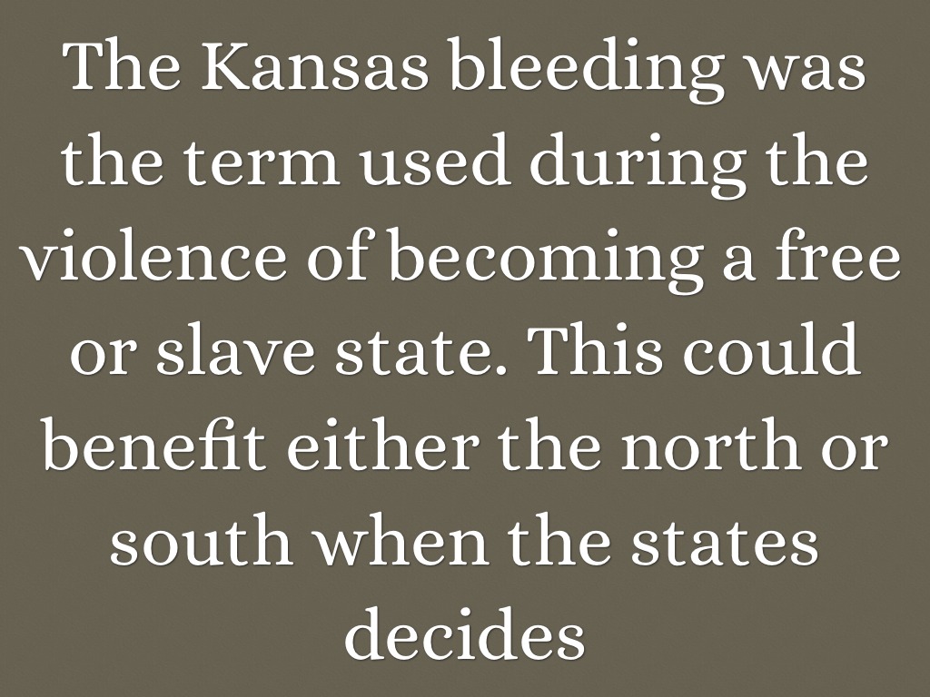 The Kansas bleeding was the term used during the violence of becoming a free or slave state. This could benefit either the north or south when the states decides