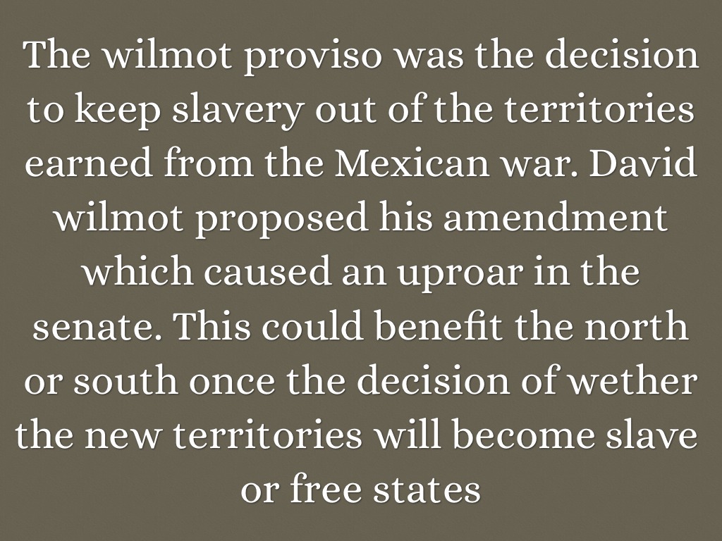 The wilmot proviso was the decision to keep slavery out of the territories earned from the Mexican war. David wilmot proposed his amendment which caused an uproar in the senate. This could benefit the north or south once the decision of wether the new territories will become slave or free states