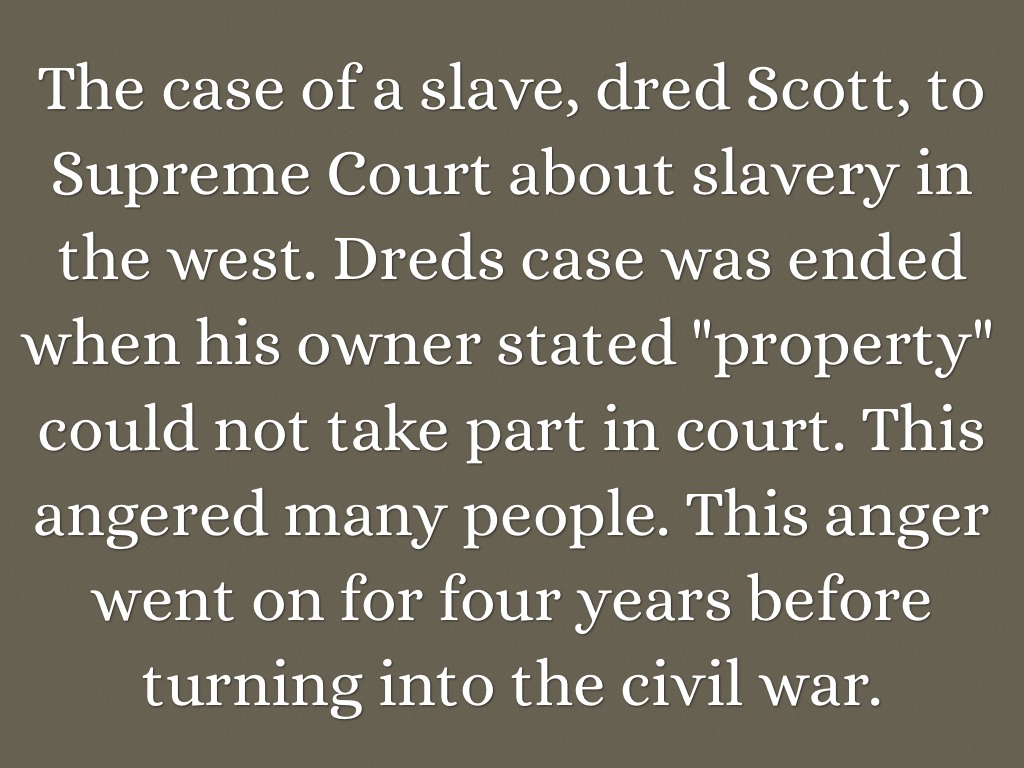 The case of a slave, dred Scott, to Supreme Court about slavery in the west. Dreds case was ended when his owner stated "property" could not take part in court. This angered many people. This anger went on for four years before turning into the civil war.