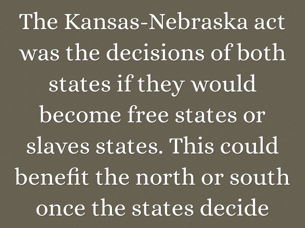 The Kansas-Nebraska act was the decisions of both states if they would become free states or slaves states. This could benefit the north or south once the states decide