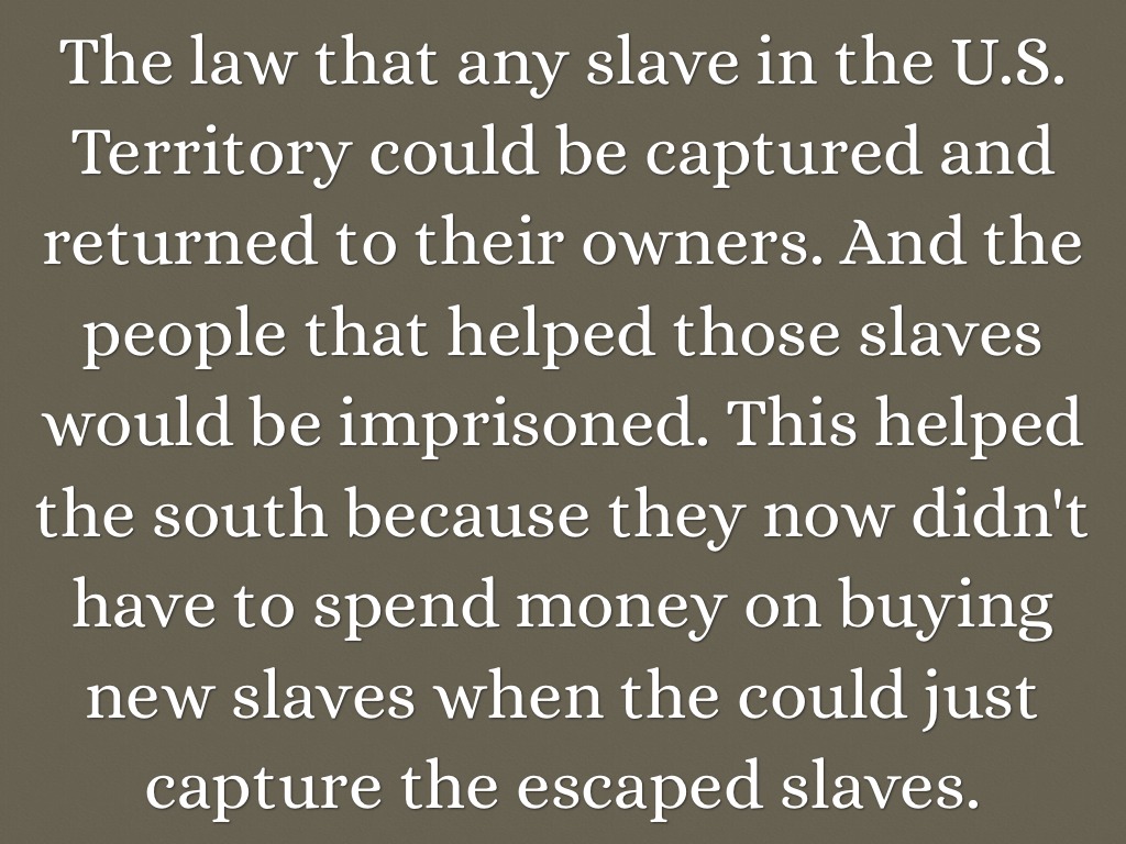 The law that any slave in the U.S. Territory could be captured and returned to their owners. And the people that helped those slaves would be imprisoned. This helped the south because they now didn't have to spend money on buying new slaves when the could just capture the escaped slaves.