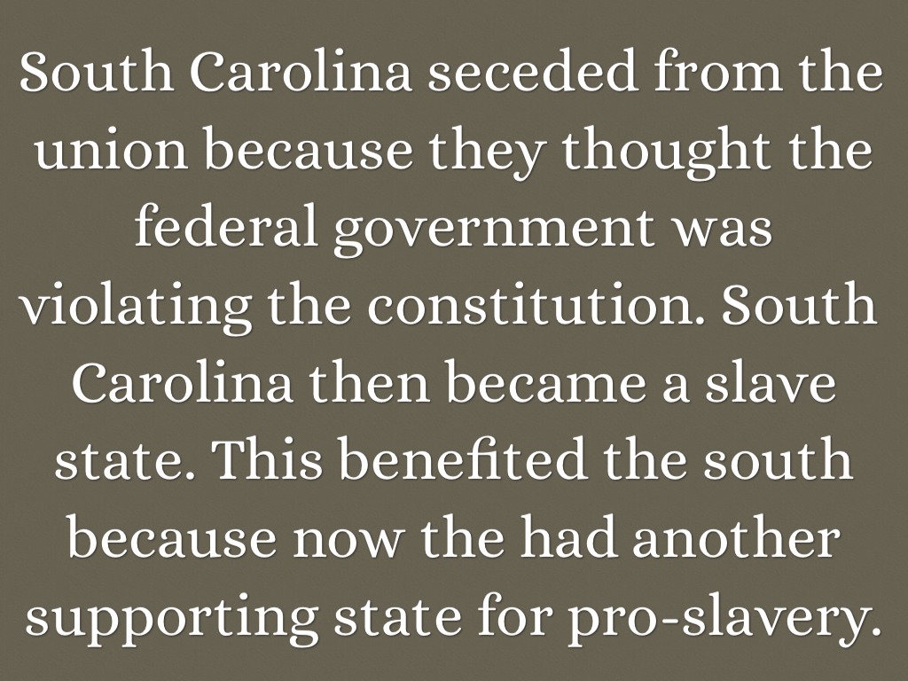 South Carolina seceded from the union because they thought the federal government was violating the constitution. South Carolina then became a slave state. This benefited the south because now the had another supporting state for pro-slavery.