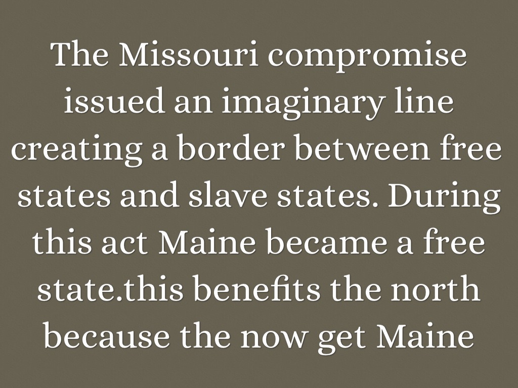 The Missouri compromise issued an imaginary line creating a border between free states and slave states. During this act Maine became a free state.this benefits the north because the now get Maine