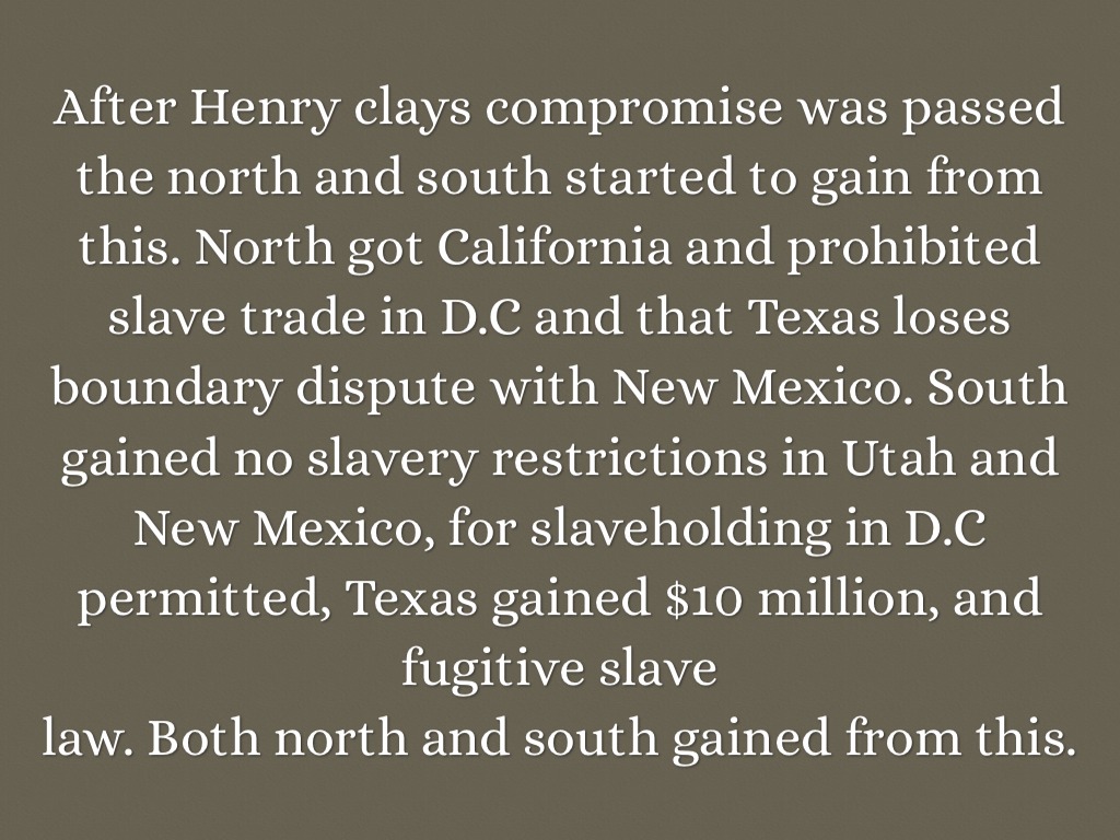 After Henry clays compromise was passed the north and south started to gain from this. North got California and prohibited slave trade in D.C and that Texas loses boundary dispute with New Mexico. South gained no slavery restrictions in Utah and New Mexico, for slaveholding in D.C permitted, Texas gained $10 million, and fugitive slave