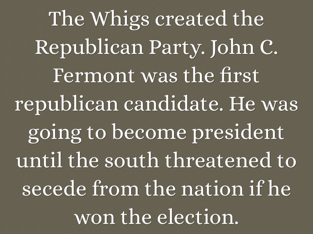 The Whigs created the Republican Party. John C. Fermont was the first republican candidate. He was going to become president until the south threatened to secede from the nation if he won the election.