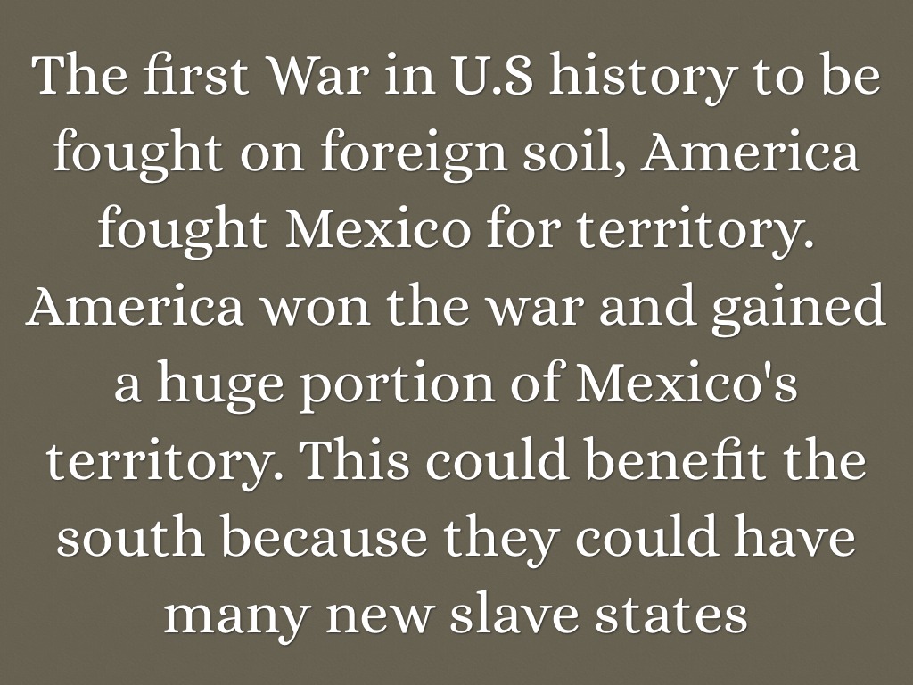 The first War in U.S history to be fought on foreign soil, America fought Mexico for territory. America won the war and gained a huge portion of Mexico's territory. This could benefit the south because they could have many new slave states