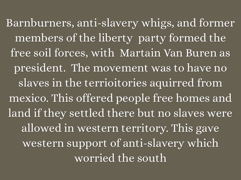 Barnburners, anti-slavery whigs, and former members of the liberty party formed the free soil forces, with Martain Van Buren as president. The movement was to have no slaves in the terrioitories aquirred from mexico. This offered people free homes and land if they settled there but no slaves were allowed in western territory. This gave western support of anti-slavery which worried the south