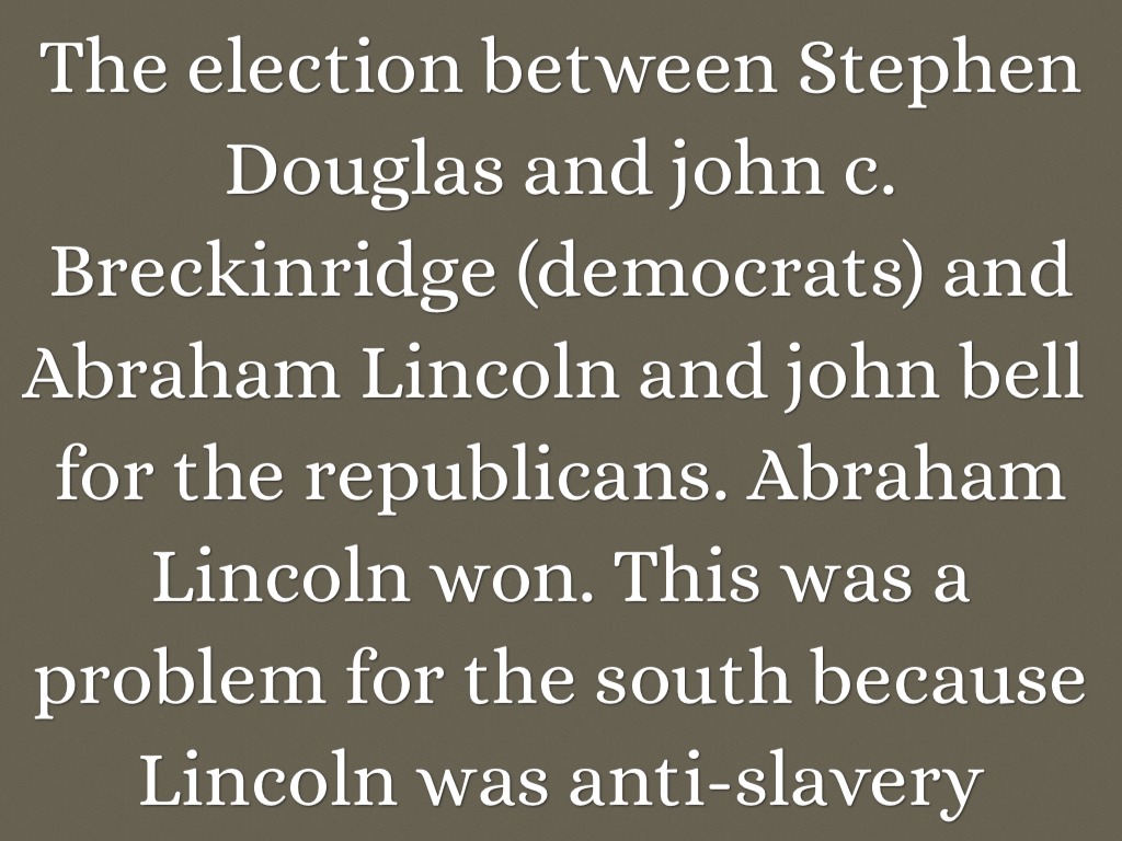 The election between Stephen Douglas and john c. Breckinridge (democrats) and Abraham Lincoln and john bell for the republicans. Abraham Lincoln won. This was a problem for the south because Lincoln was anti-slavery