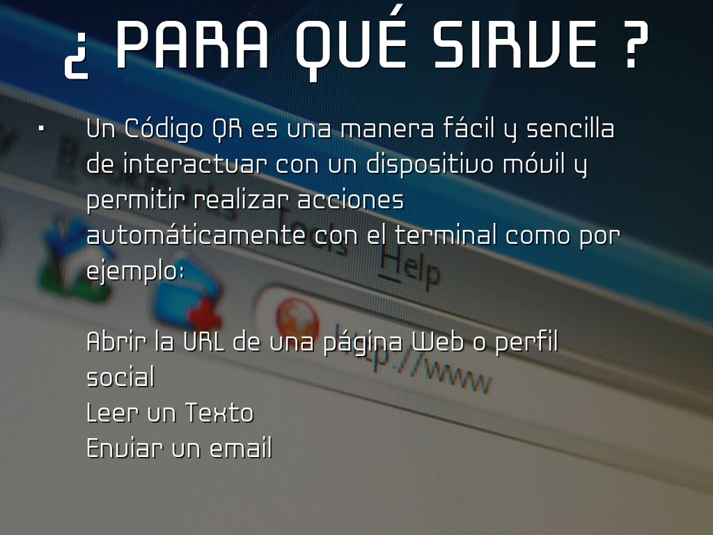 Un Código QR es una manera fácil y sencilla de interactuar con un dispositivo móvil y permitir realizar acciones automáticamente con el terminal como por ejemplo: