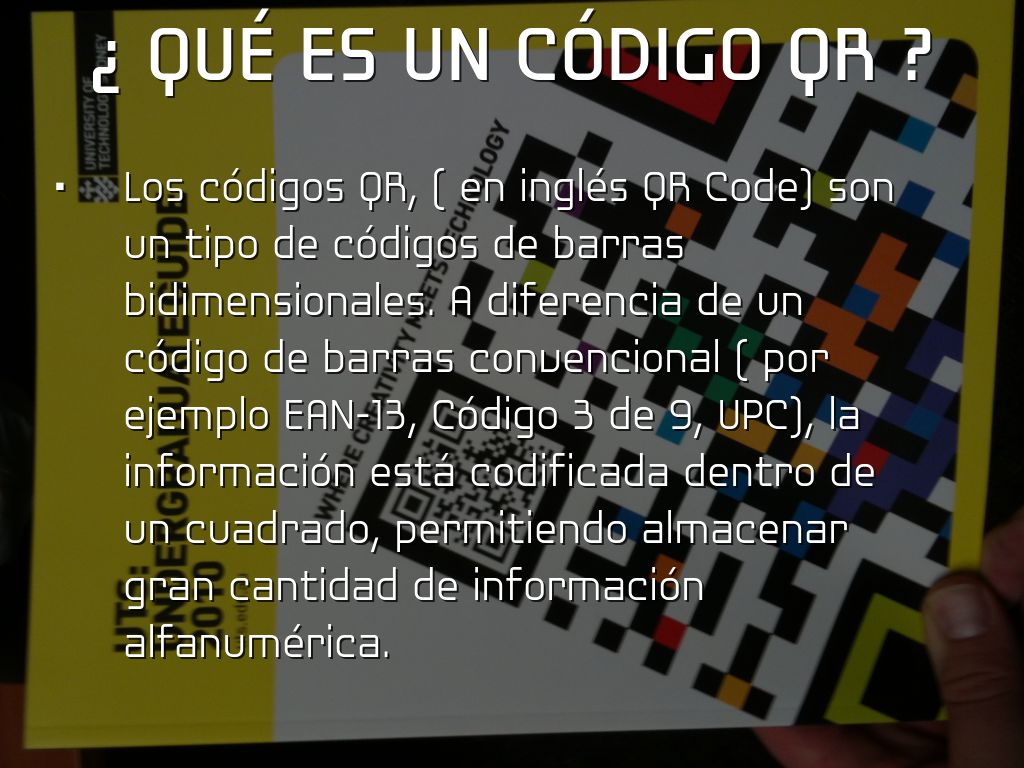 Los códigos QR, ( en inglés QR Code) son un tipo de códigos de barras bidimensionales. A diferencia de un código de barras convencional ( por ejemplo EAN-13, Código 3 de 9, UPC), la información está codificada dentro de un cuadrado, permitiendo almacenar gran cantidad de información alfanumérica.