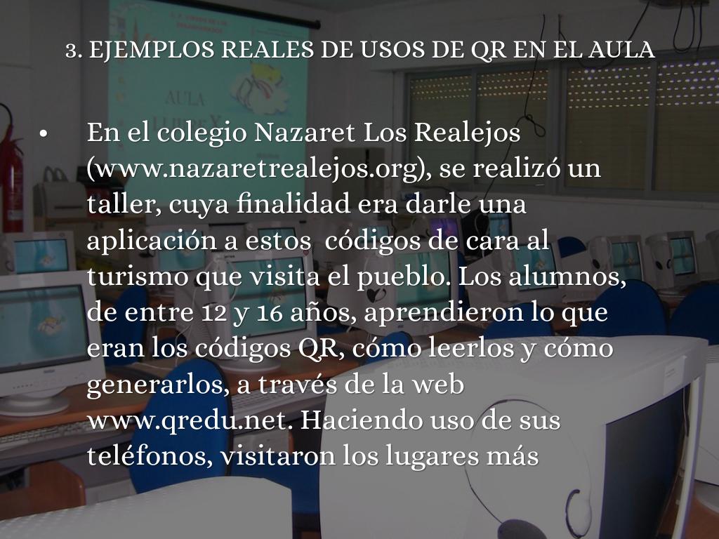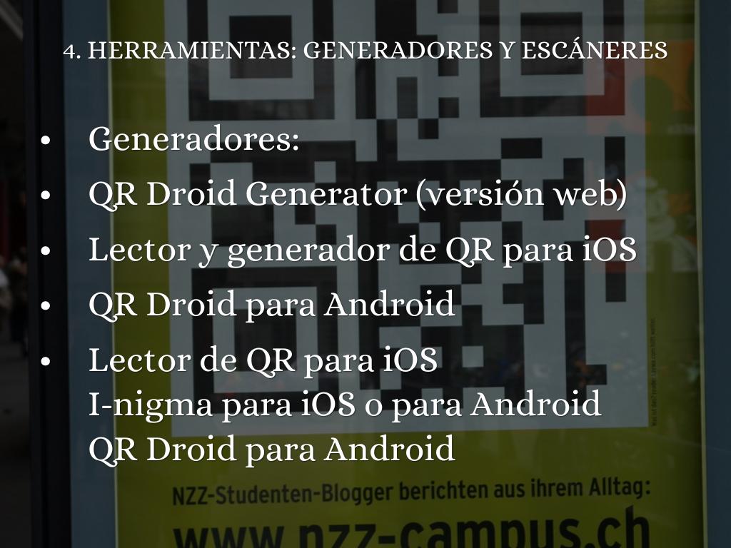Esta presentación trata sobre los códigos QR, Quick R Response (respuesta rápida o inmediata), una tecnología que permite el diseño de actividades de aprendizaje basadas en el uso de los dispositivos móviles. Las características de esta herramienta la hacen motivadora para los alumnos ya que les supone un juego planteado en el formato natural para ellos: inmediato, activo y multimedia.