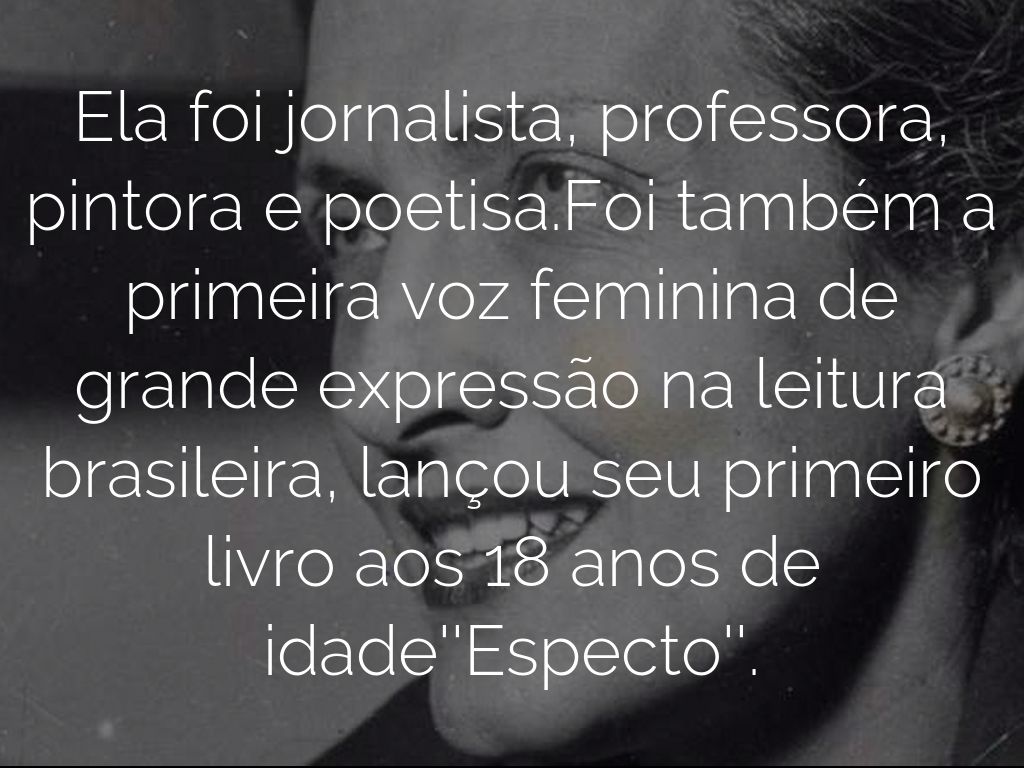 Ela foi jornalista, professora, pintora e poetisa.Foi também a primeira voz feminina de grande expressão na leitura brasileira, lançou seu primeiro livro aos 18 anos de idade''Especto''.