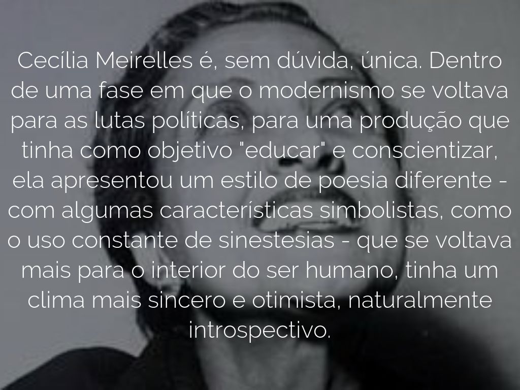 Cecília Meirelles é, sem dúvida, única. Dentro de uma fase em que o modernismo se voltava para as lutas políticas, para uma produção que tinha como objetivo "educar" e conscientizar, ela apresentou um estilo de poesia diferente - com algumas características simbolistas, como o uso constante de sinestesias - que se voltava mais para o interior do ser humano, tinha um clima mais sincero e otimista, naturalmente introspectivo.