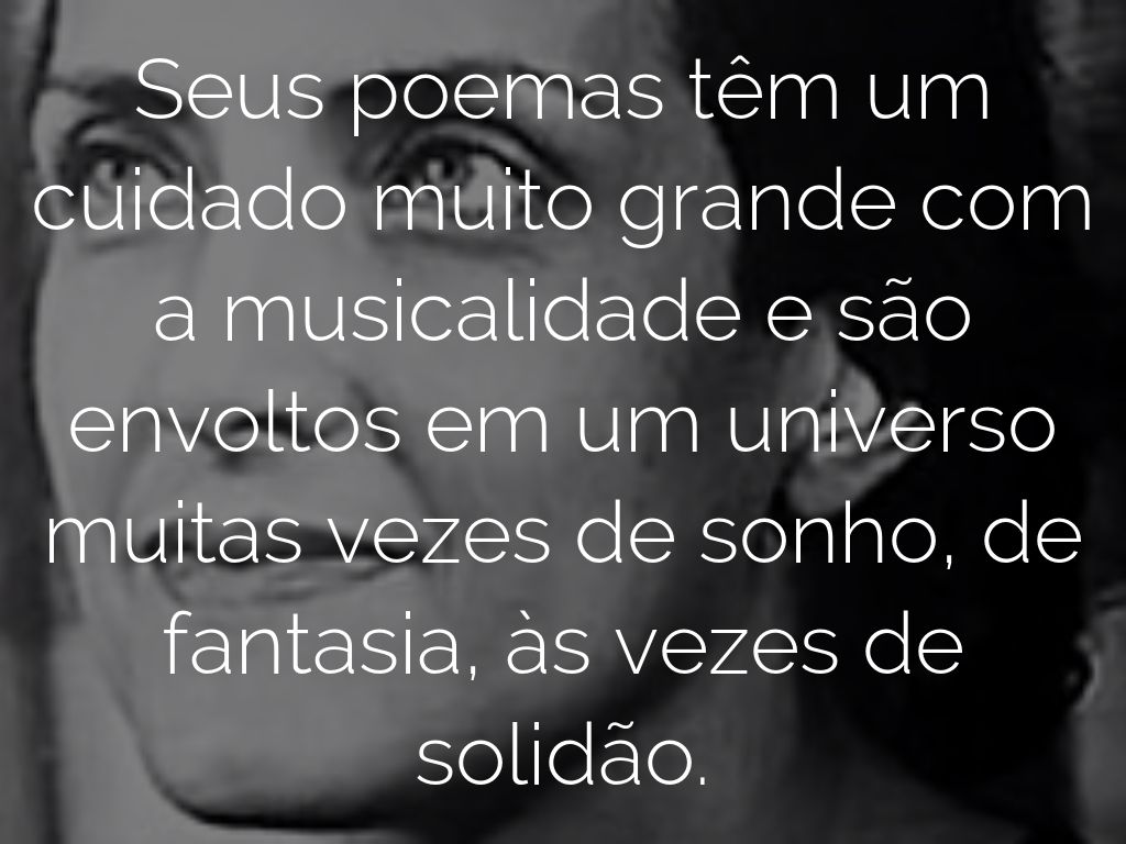 Seus poemas têm um cuidado muito grande com a musicalidade e são envoltos em um universo muitas vezes de sonho, de fantasia, às vezes de solidão.