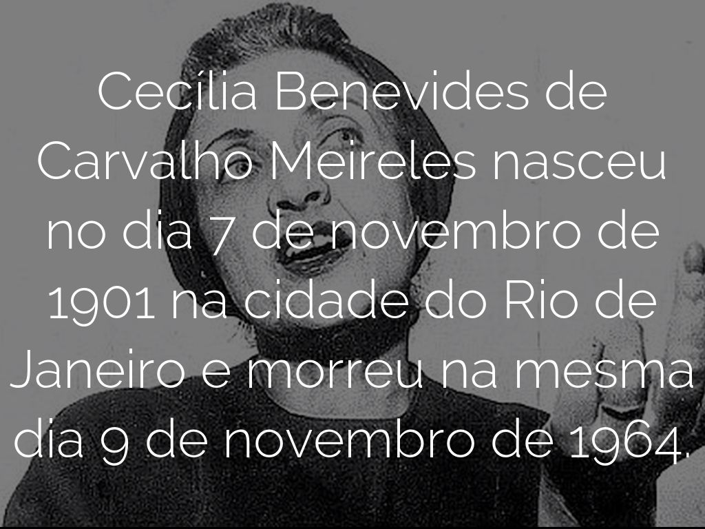 Cecília Benevides de Carvalho Meireles nasceu no dia 7 de novembro de 1901 na cidade do Rio de Janeiro e morreu na mesma dia 9 de novembro de 1964.