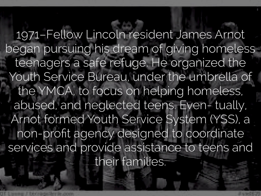 1971–Fellow Lincoln resident James Arnot began pursuing his dream of giving homeless teenagers a safe refuge. He organized the Youth Service Bureau, under the umbrella of the YMCA, to focus on helping homeless, abused, and neglected teens. Even- tually, Arnot formed Youth Service System (YSS), a non-profit agency designed to coordinate services and provide assistance to teens and their families.