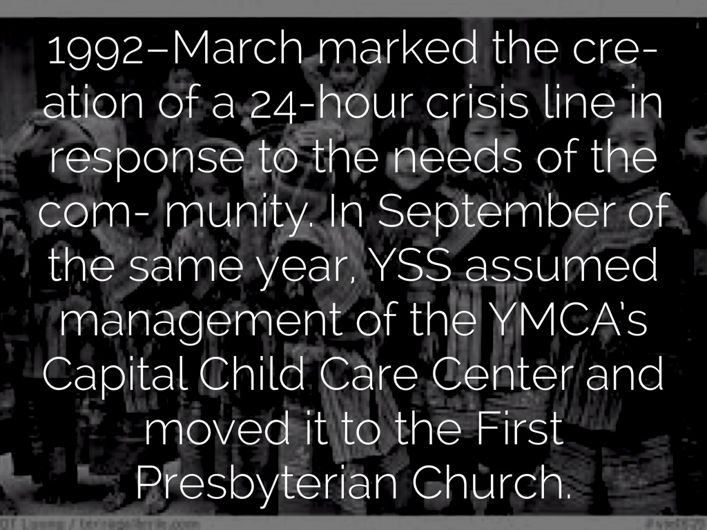 1992–March marked the cre- ation of a 24-hour crisis line in response to the needs of the com- munity. In September of the same year, YSS assumed management of the YMCA’s Capital Child Care Center and moved it to the First Presbyterian Church.