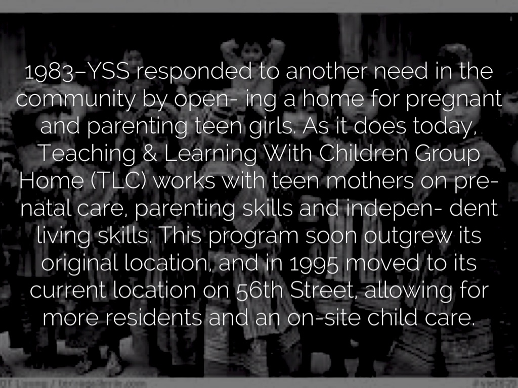 1983–YSS responded to another need in the community by open- ing a home for pregnant and parenting teen girls. As it does today, Teaching & Learning With Children Group Home (TLC) works with teen mothers on pre-natal care, parenting skills and indepen- dent living skills. This program soon outgrew its original location, and in 1995 moved to its current location on 56th Street, allowing for more residents and an on-site child care.