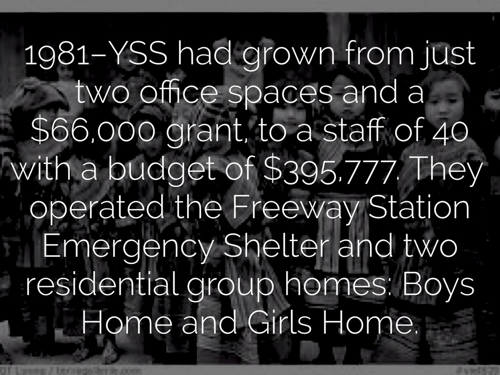 1981–YSS had grown from just two office spaces and a $66,000 grant, to a staff of 40 with a budget of $395,777. They operated the Freeway Station Emergency Shelter and two residential group homes: Boys Home and Girls Home.