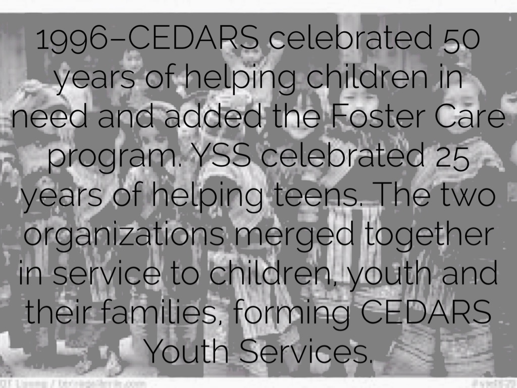 1996–CEDARS celebrated 50 years of helping children in need and added the Foster Care program. YSS celebrated 25 years of helping teens. The two organizations merged together in service to children, youth and their families, forming CEDARS Youth Services.