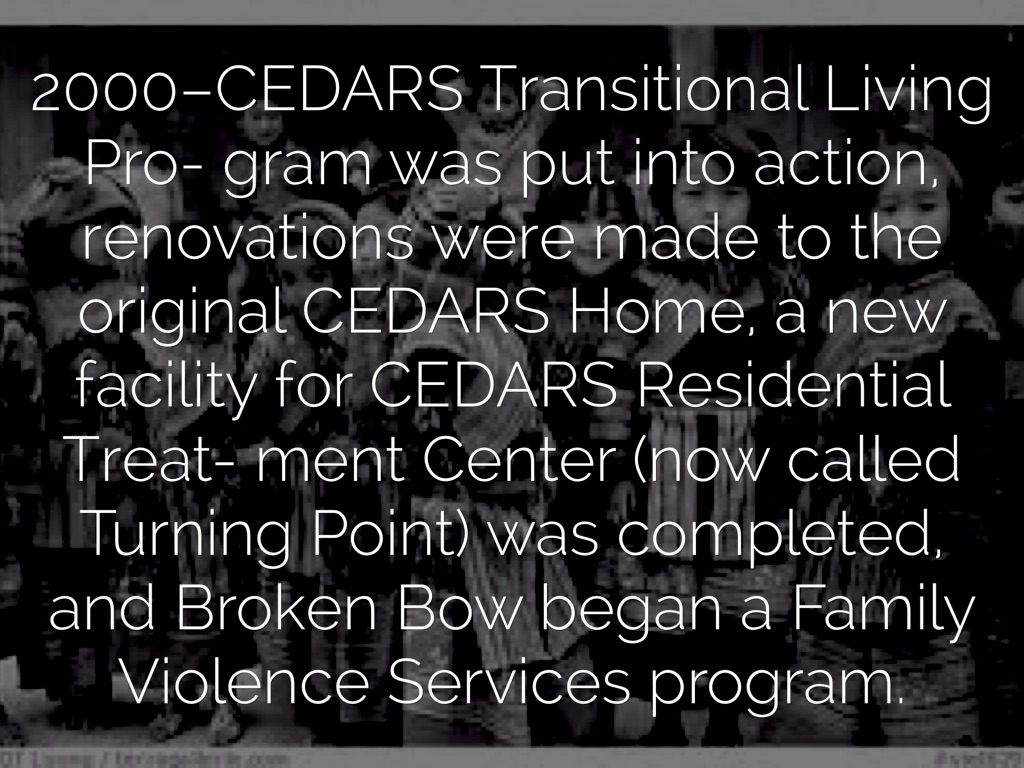 2000–CEDARS Transitional Living Pro- gram was put into action, renovations were made to the original CEDARS Home, a new facility for CEDARS Residential Treat- ment Center (now called Turning Point) was completed, and Broken Bow began a Family Violence Services program.