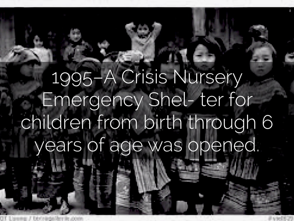 1995–A Crisis Nursery Emergency Shel- ter for children from birth through 6 years of age was opened.