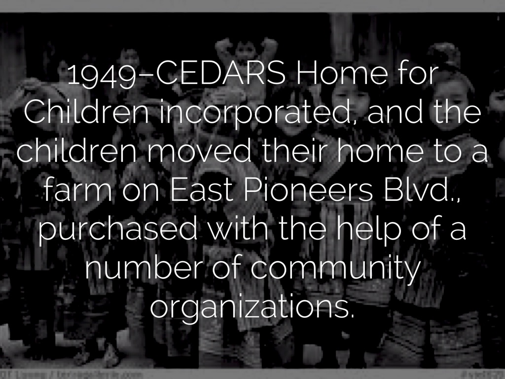 1949–CEDARS Home for Children incorporated, and the children moved their home to a farm on East Pioneers Blvd., purchased with the help of a number of community organizations.