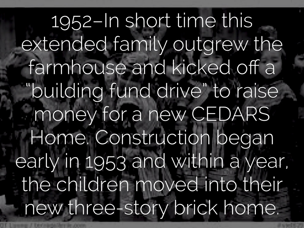 1952–In short time this extended family outgrew the farmhouse and kicked off a “building fund drive” to raise money for a new CEDARS Home. Construction began early in 1953 and within a year, the children moved into their new three-story brick home.