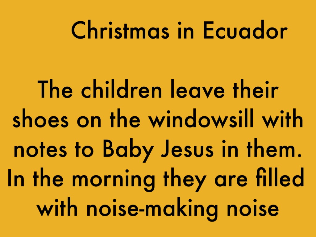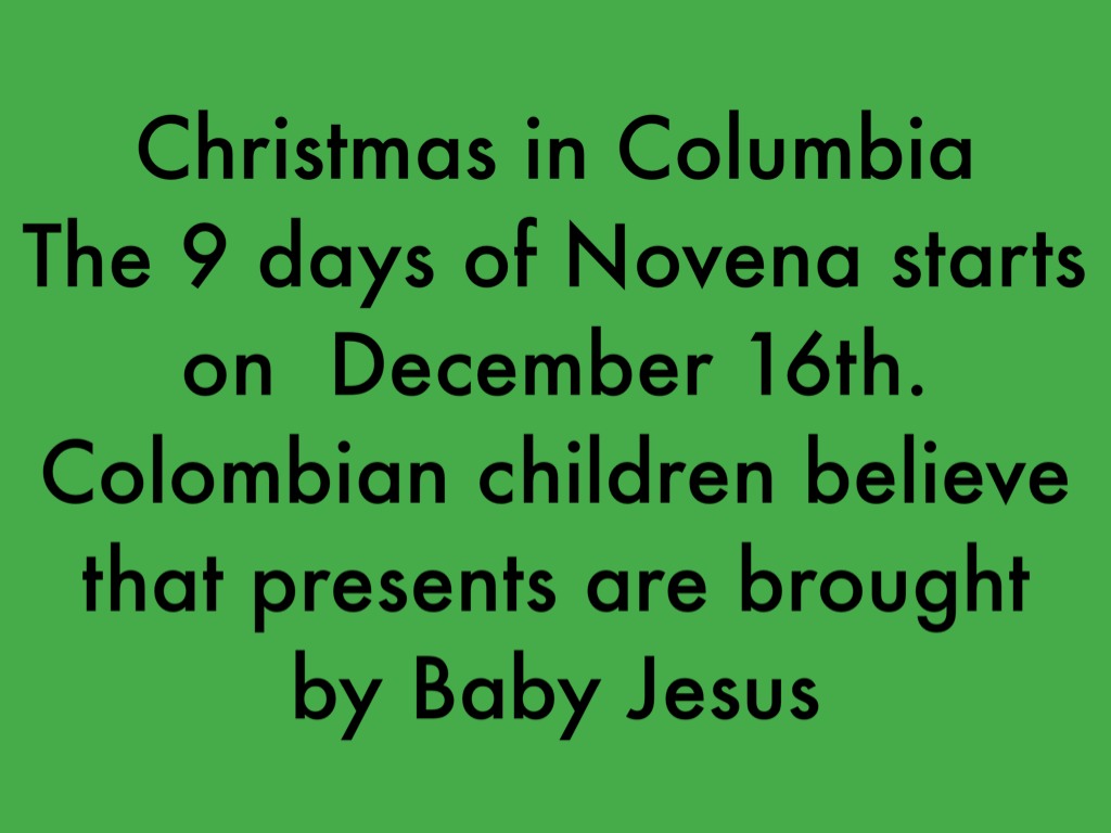 The 9 days of Novena starts on December 16th. Colombian children believe that presents are brought by Baby Jesus
