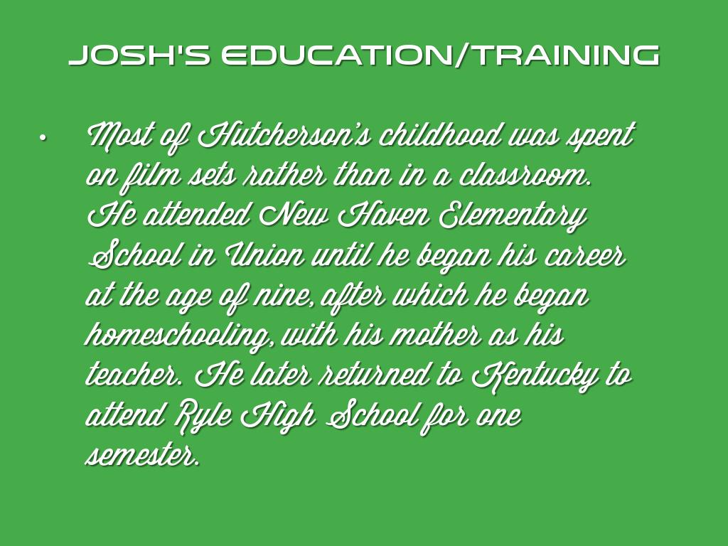 Most of Hutcherson's childhood was spent on film sets rather than in a classroom. He attended New Haven Elementary School in Union until he began his career at the age of nine, after which he began homeschooling, with his mother as his teacher. He later returned to Kentucky to attend Ryle High School for one semester.