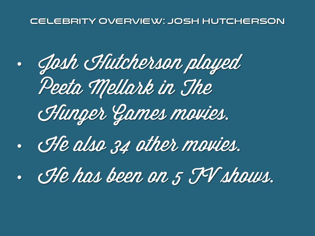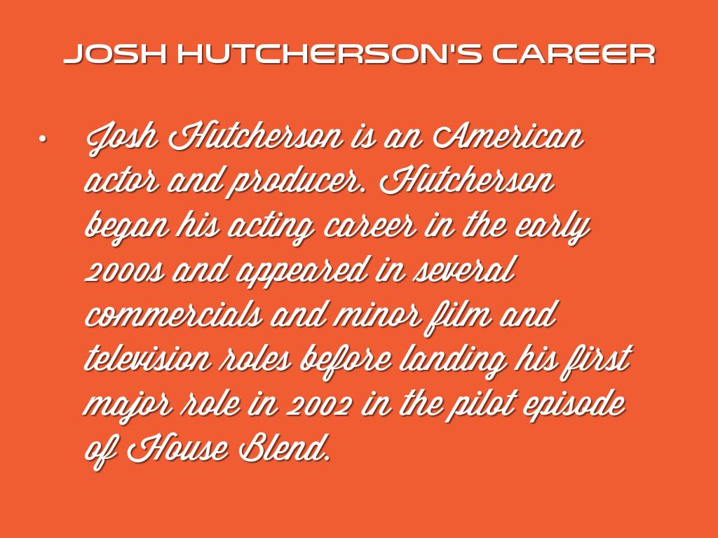 Josh Hutcherson is an American actor and producer. Hutcherson began his acting career in the early 2000s and appeared in several commercials and minor film and television roles before landing his first major role in 2002 in the pilot episode of House Blend.