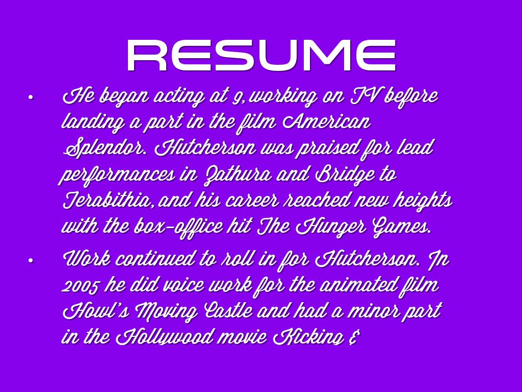 He began acting at 9, working on TV before landing a part in the film American Splendor. Hutcherson was praised for lead performances in Zathura and Bridge to Terabithia, and his career reached new heights with the box-office hit The Hunger Games.