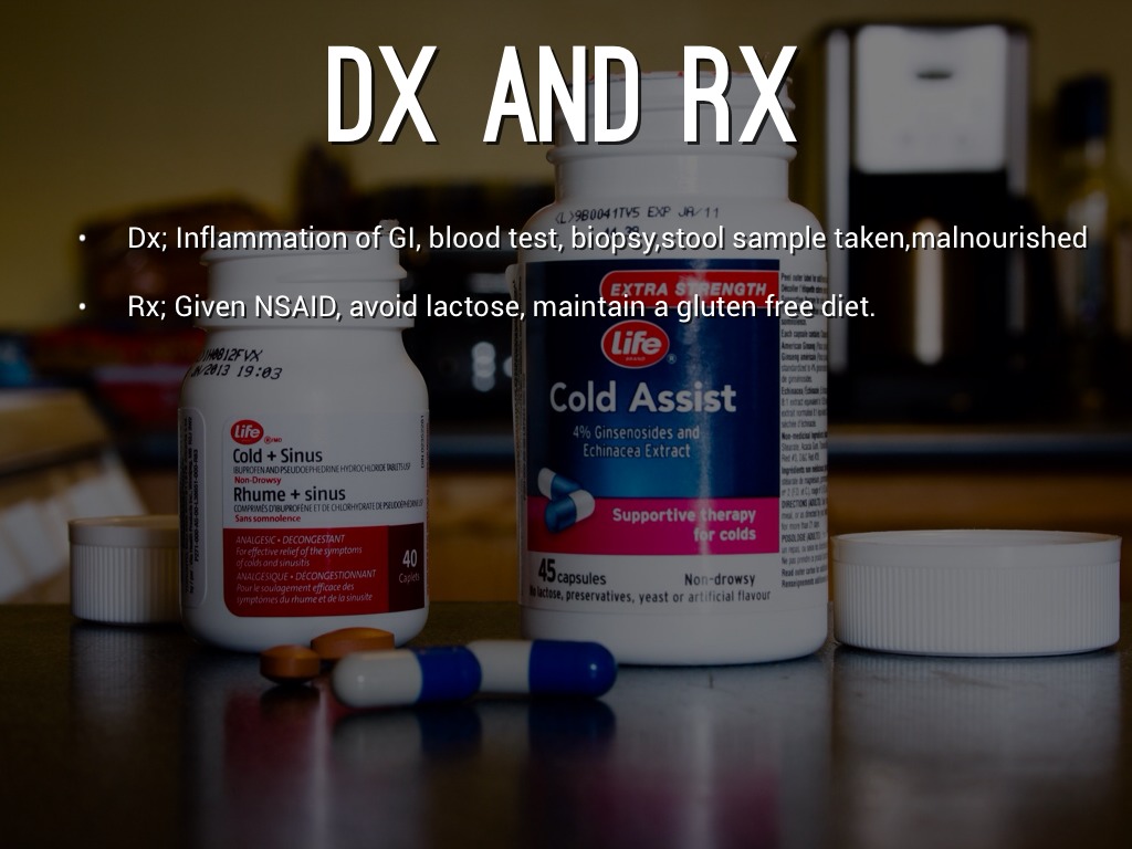 Rx; Given NSAID, avoid lactose, maintain a gluten free diet.