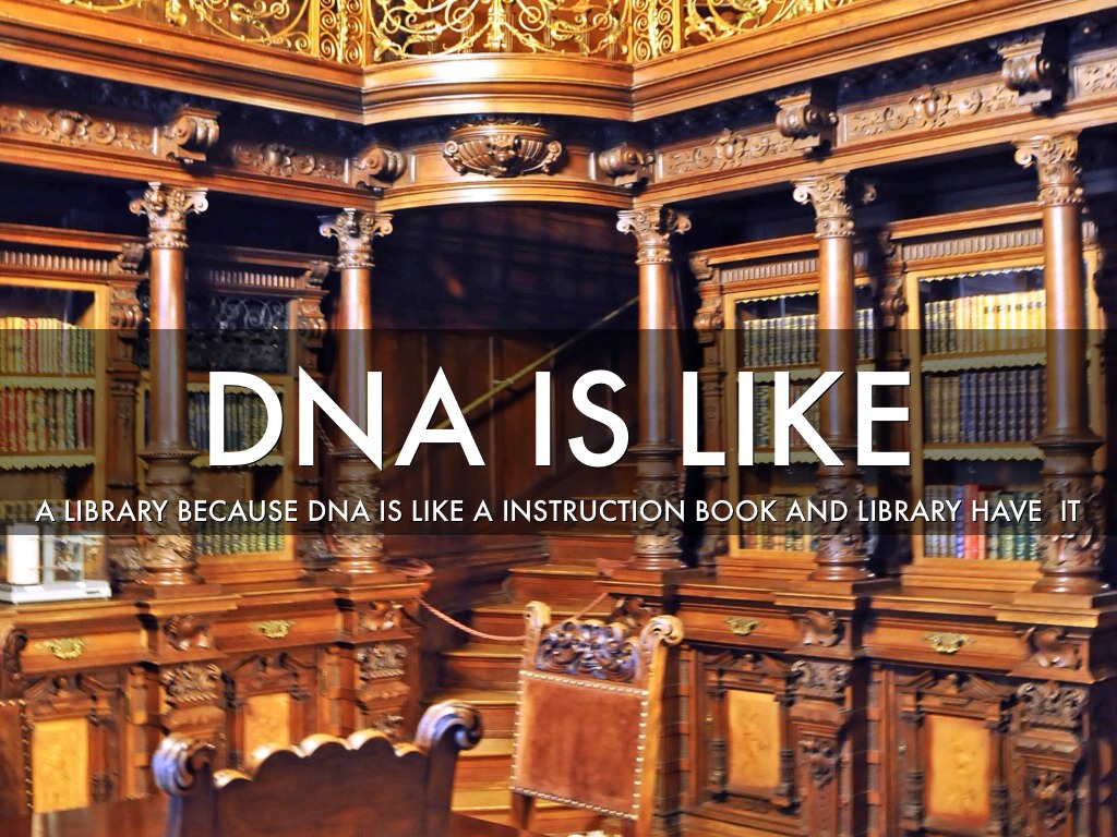 A LIBRARY BECAUSE DNA IS LIKE A INSTRUCTION BOOK AND LIBRARY HAVE IT