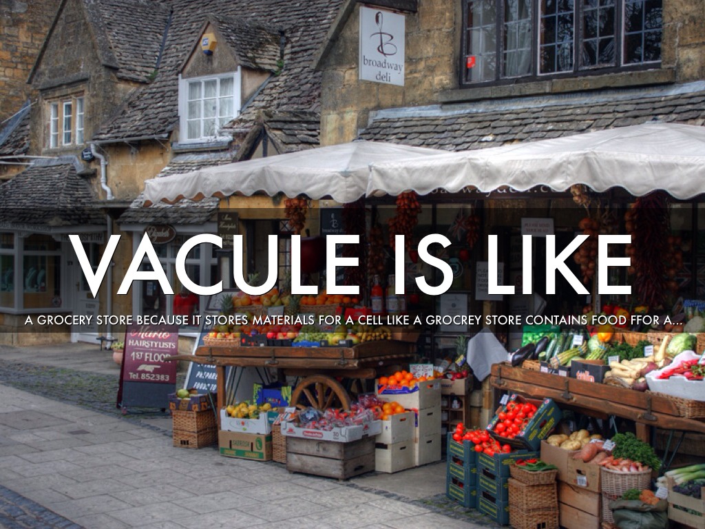 A GROCERY STORE BECAUSE IT STORES MATERIALS FOR A CELL LIKE A GROCREY STORE CONTAINS FOOD FFOR A HUMAN