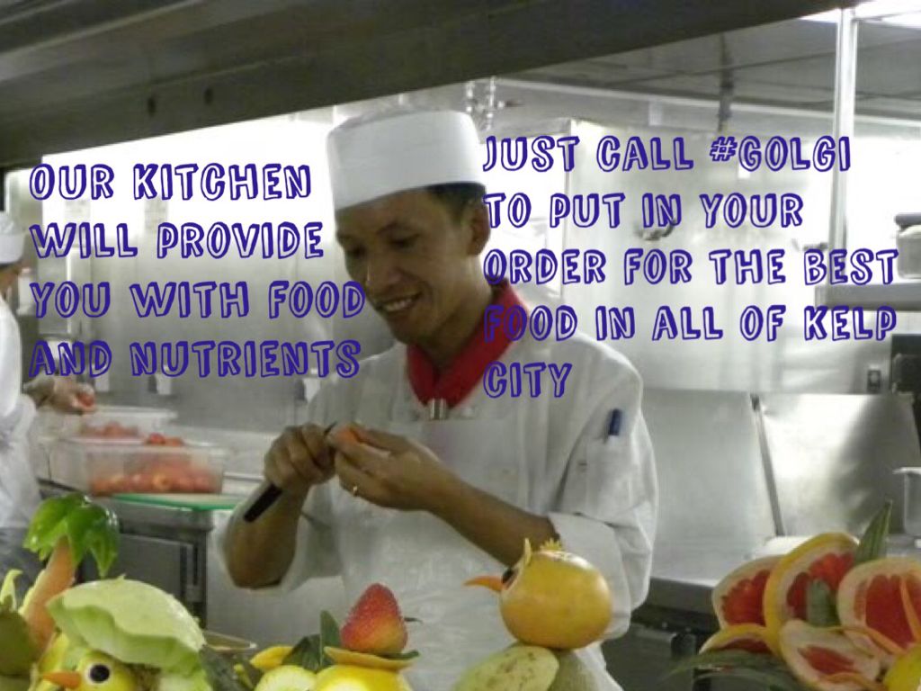 The golgi body makes food for the cell like a kitchen would for the people at the hotel.