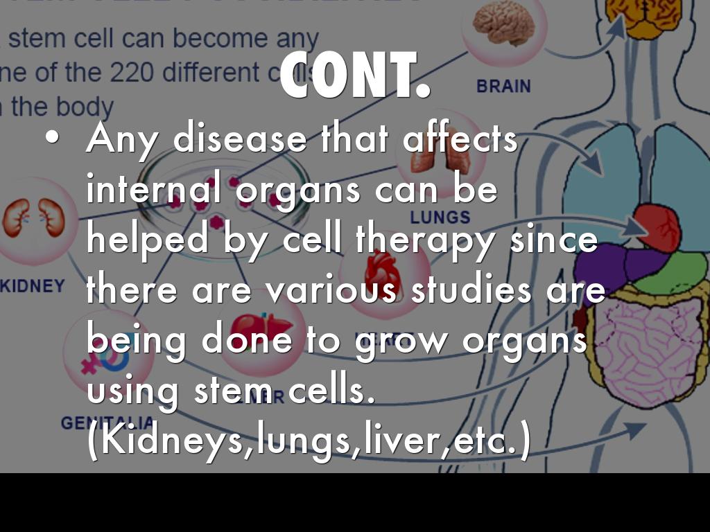 Any disease that affects internal organs can be helped by cell therapy since there are various studies are being done to grow organs using stem cells. (Kidneys,lungs,liver,etc.)